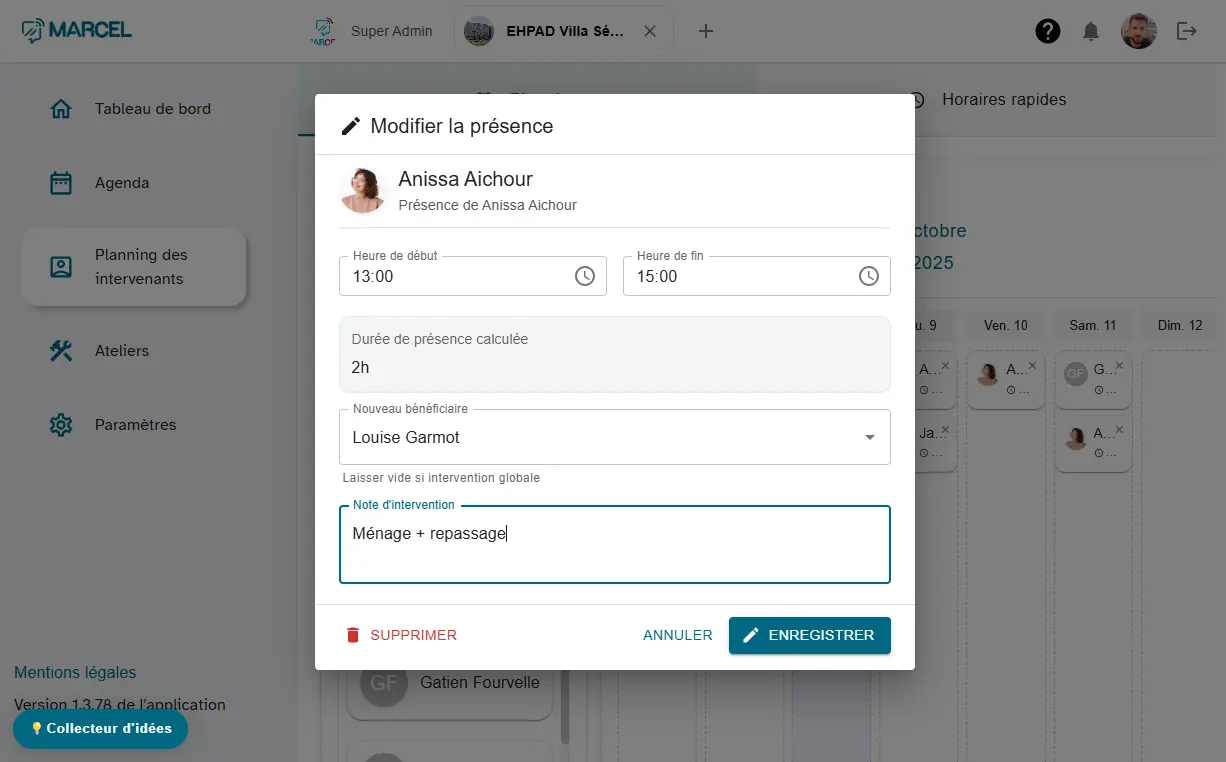 - Ajouter des notes et/ou des bénéficiaires pour chaque temps de présence